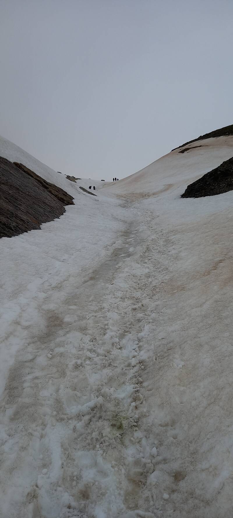 7 uur glibberen en glijden door de sneeuw en alsmaar klimmen. De enige afwisseling bestond in het klauteren over de rotsen en het ontwijken van sinkholes in de sneeuw, waardoor je zomaar een halve meter naar beneden valt.