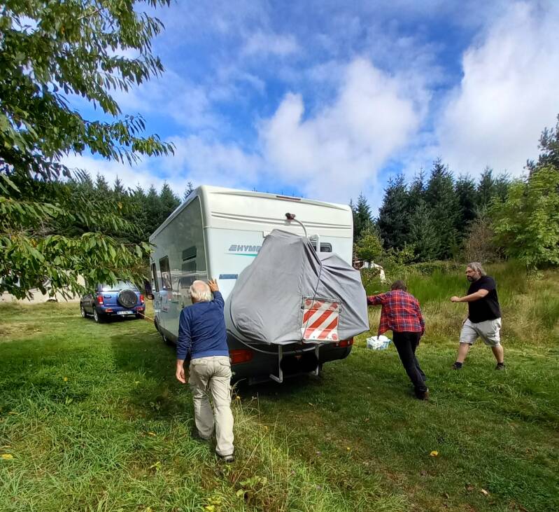 Omdat 't de laatste dagen in de bergen van de Ardèche geonweerd en flink geregend had, en daarom de bodem drassig was, kreeg ik de camper niet van z'n plek.