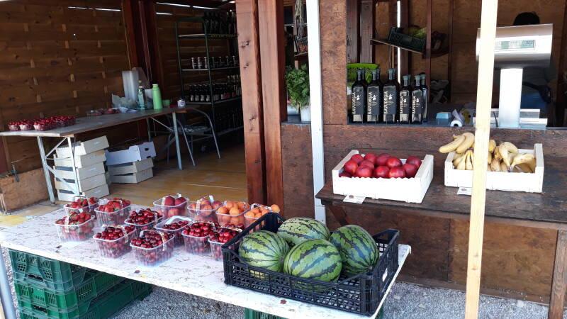 Onderweg tijdens m'n fietstocht zag ik een aantal kraampjes waar men fruit, olijfolie en zelf gestookte likeur verkoopt.